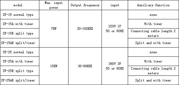 SP-15 and SP-25 series machines are acterized with simple structure, high reliability and low price, and are one of the most popular models and have been used widely in every areas of metal heating.