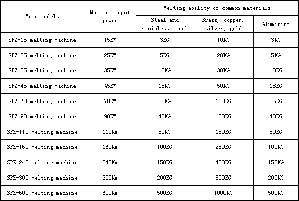 The table below lists the main models and recommended maximum melting abilities. About 50 to 60 minutes are needed to finish one melting process at cool status of the furnace, at hot status of the furnace, only 20 to 30 minutes are needed.