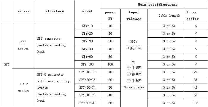 (2) SPY-C series products: These machines are consisted of SPY-C generator and portable heating head with cooling system inside, Main products include SPY-10-C2、SPY-20-C3、SPY-30-C4、SPY-60-C10.