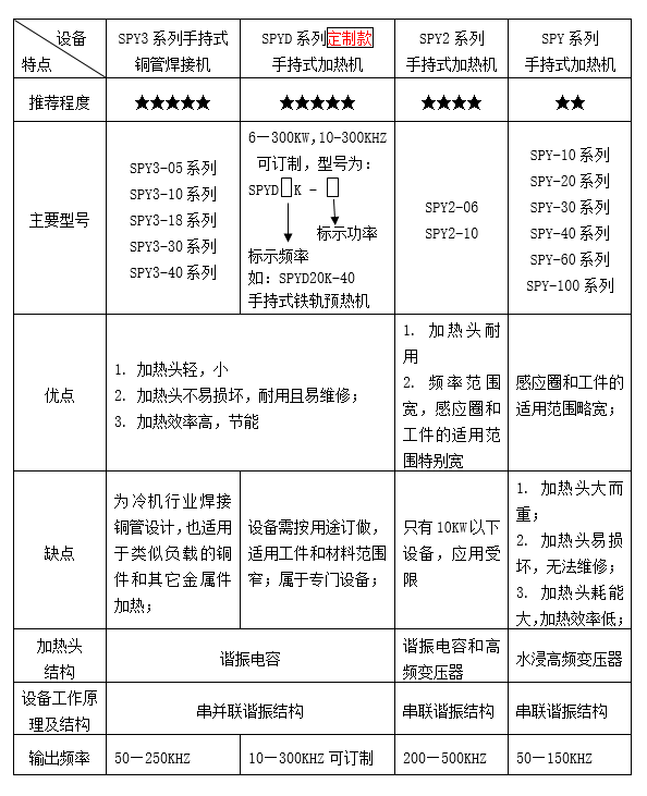 手持式加熱機是對小分機設(shè)備的一種特殊設(shè)計和應(yīng)用。 按照設(shè)備的結(jié)構(gòu)和工作原理不同,雙平手持式加熱機暫時分為以下4個系列,其特點和結(jié)構(gòu)對比如下表: 其中SPY3系列和SPYD定制系列由于其突出的優(yōu)點,應(yīng)用非常廣泛,而且隨著智能設(shè)備和自動化進程的發(fā)展,這類設(shè)備的應(yīng)用將越來越多;