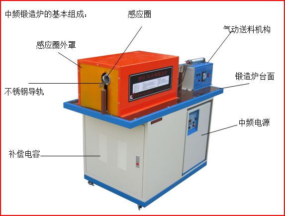 包括中頻電源、補償電容箱及工作臺、感應圈、送料機構等。根據不同的應用要求,還可能包括紅外測溫儀,控溫儀及送料、卷料等裝置;